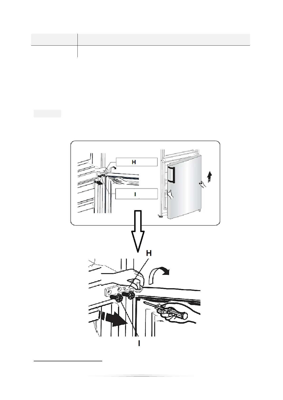 16. Unscrew the two self-tapping screws (I) of the middle door hinge (H); s. fig.