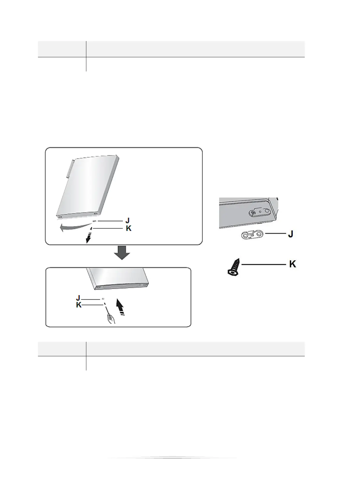 21. Unscrew the self-tapping screw (K) of the door block (J) and remove the door