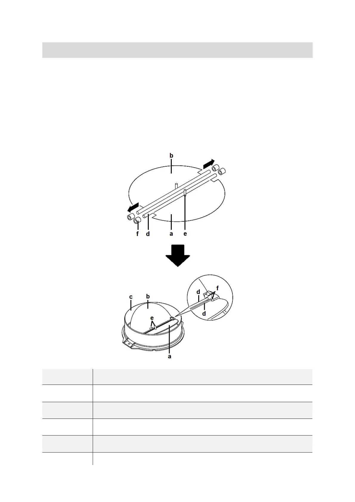 Öffnungen (f / beidseits) im Gehäuse des Abluftauslasses (c) ein; der Achsstift (e)