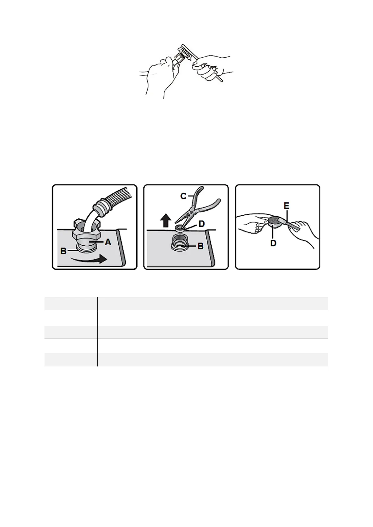 8. Reinigen Sie den Siebfilter (D) mit Wasser und einer Zahnbürste (E