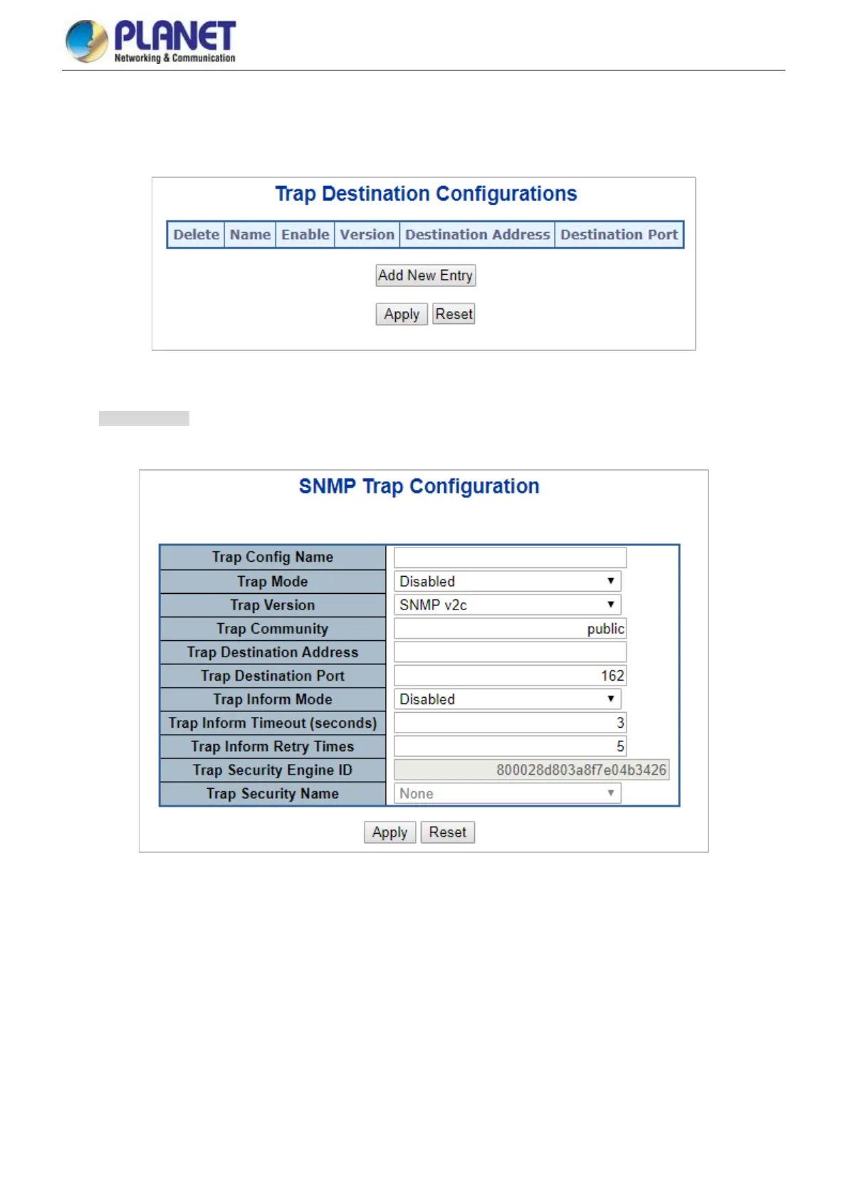 Click ‘Add New Entry” and then the SNMP Trap Configuration page appears.