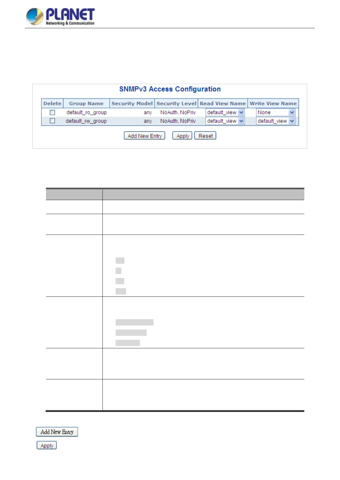 Configure SNMPv3 accesses table on this page. The entry index keys are Group Name, Security Model and Security Level.