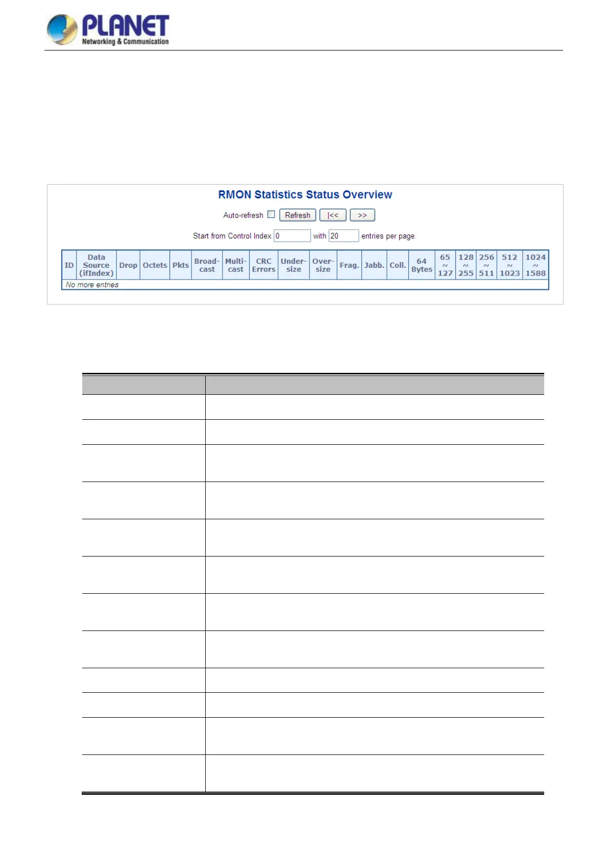This page provides an overview of RMON Statistics entries. Each page shows up to 99 entries from the Statistics table, default