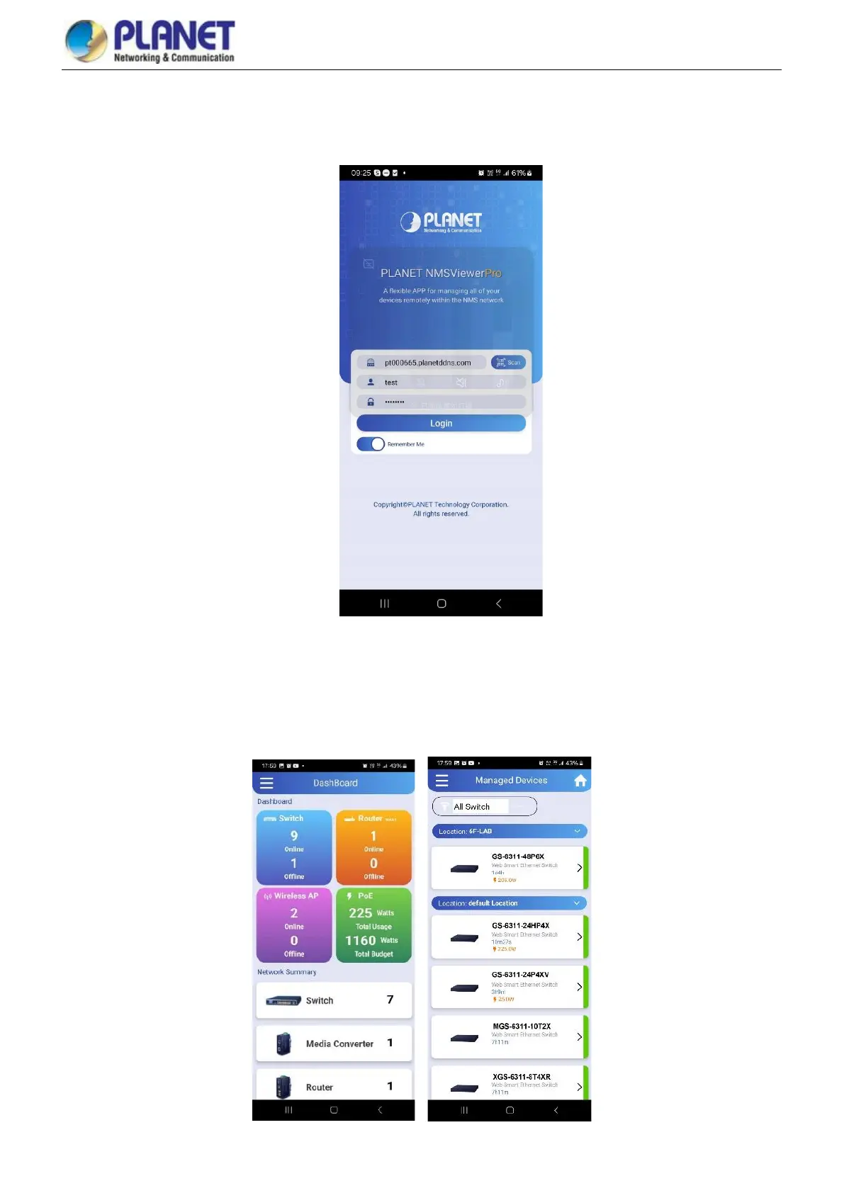 After logging in the app, you can see the Dashboard and Managed Devices found in the NMS-500/1000V.
