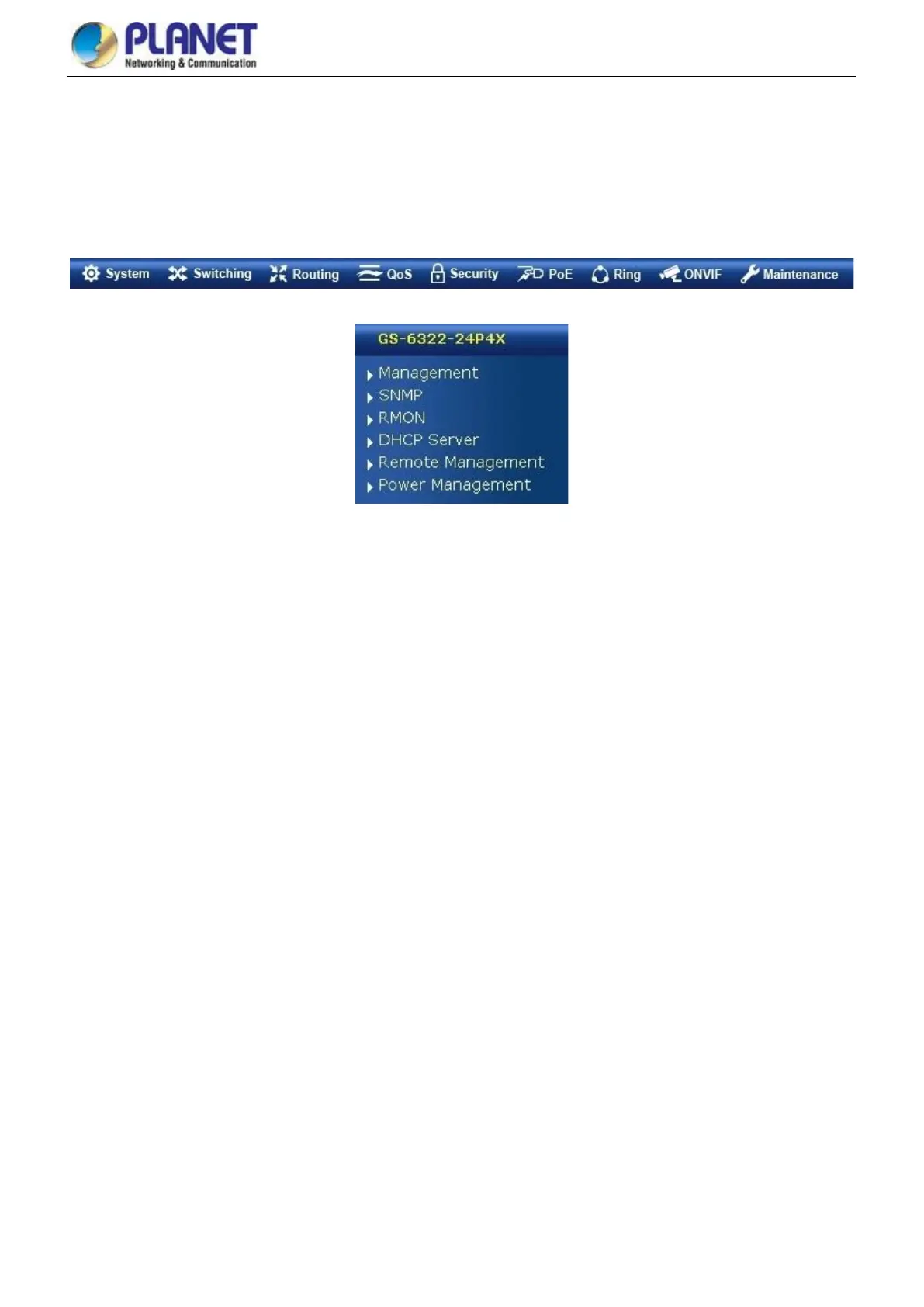 or monitor network conditions. Via the Web-Management, the administrator can set up the Managed Switch by selecting the