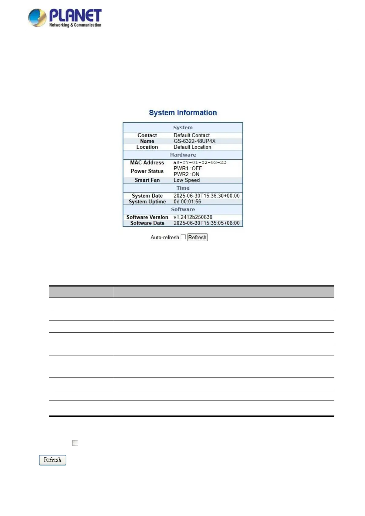 administrator to identify the hardware MAC address, software version and system uptime. The screen in Figure 4-2-1 appears.