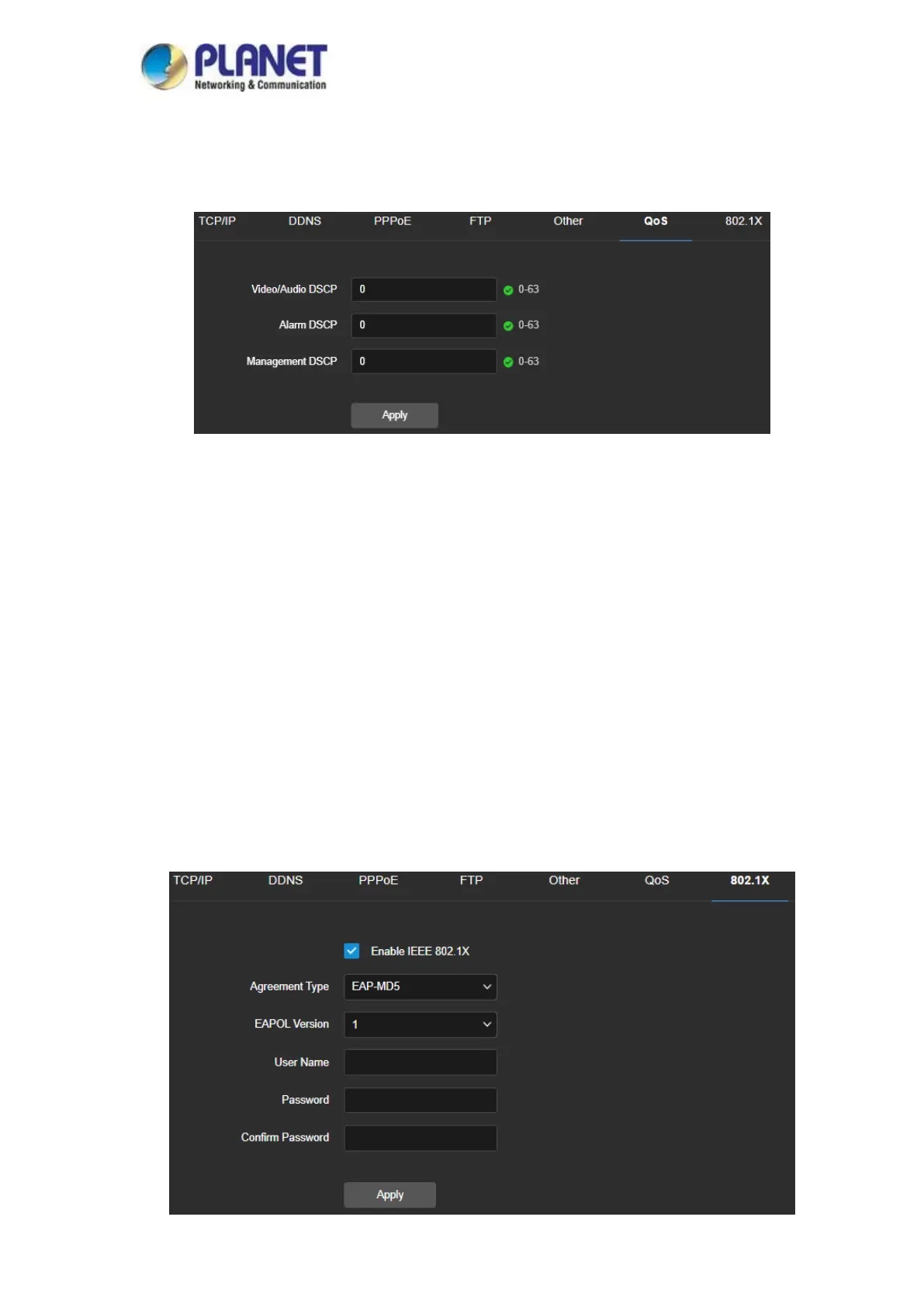 【Alarm DSCP】 You can input the value manually to set the "Alarm DSCP". These values will be