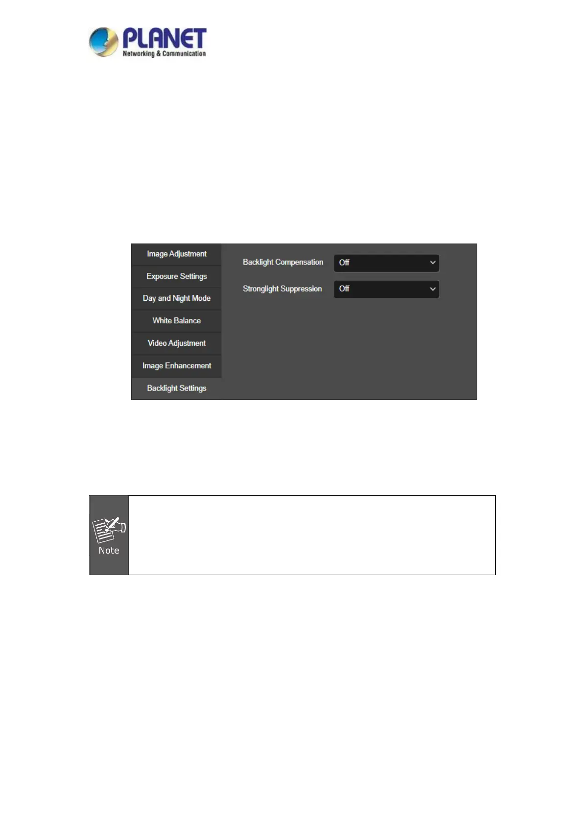 【Backlight Settings】Used to set backlight compensation and strong light compensation, as
