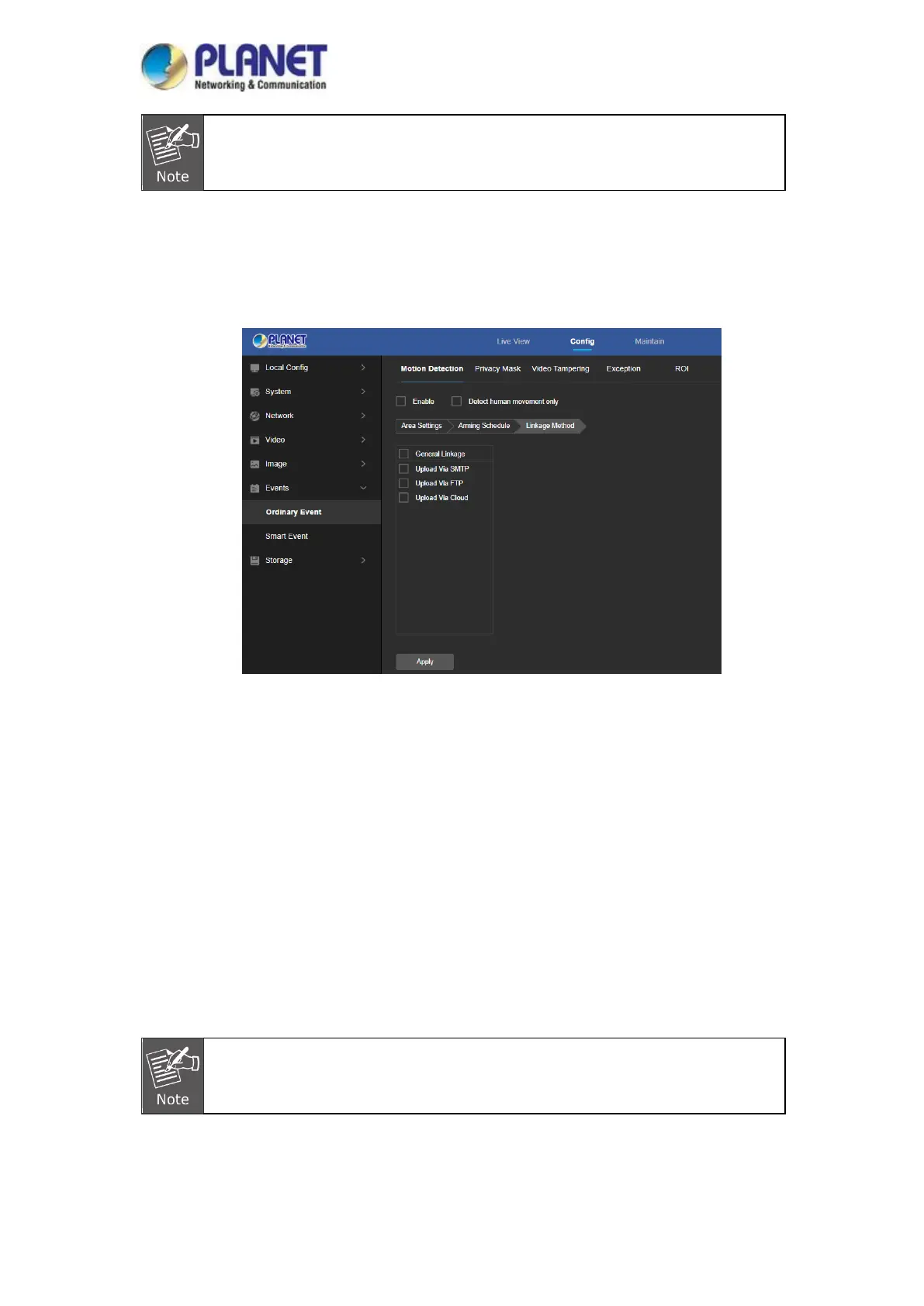 【Upload Via SMTP】Select and the system is configured with SMTP, the alarm information will be