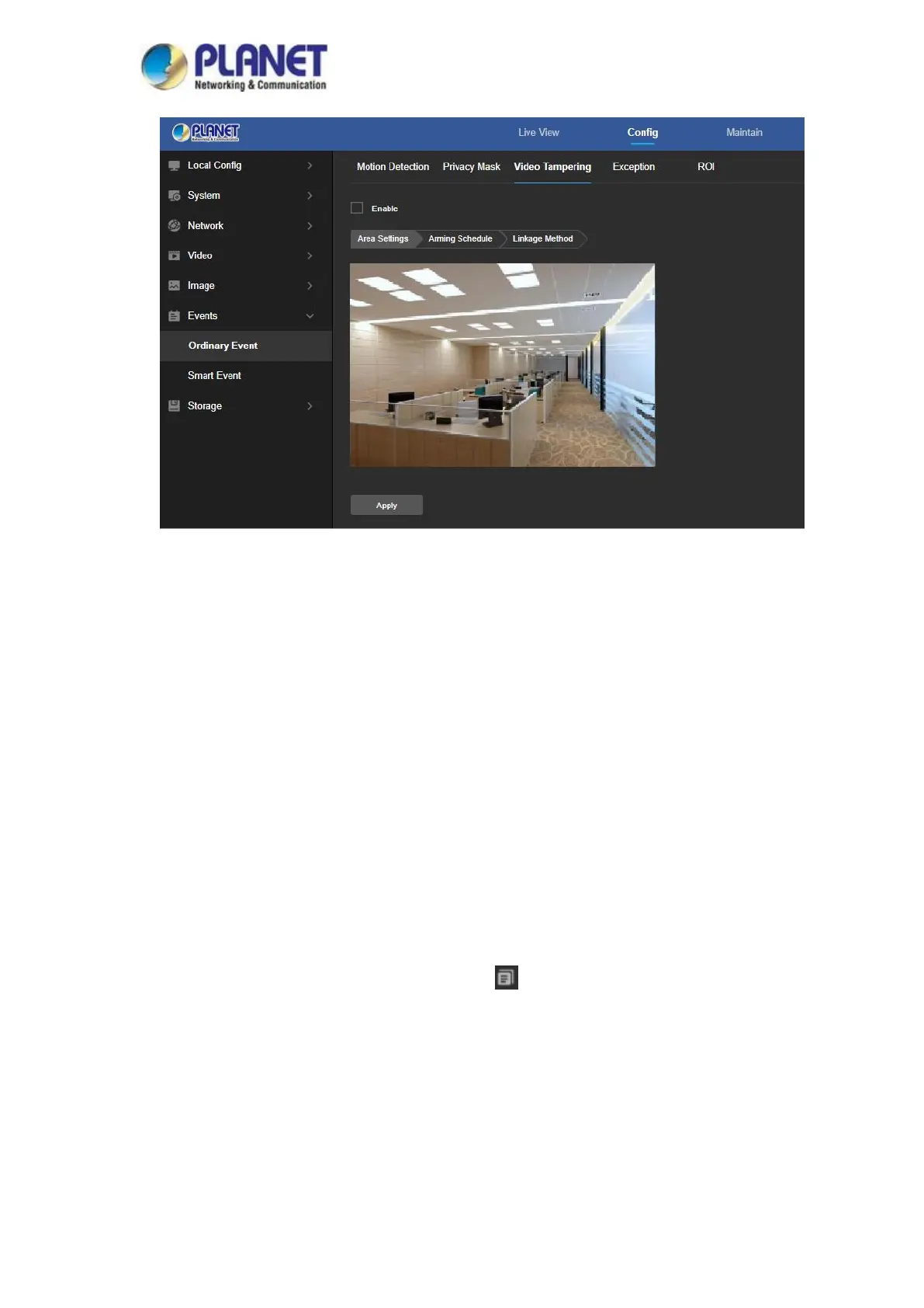 Step 2: Click "Enable" to turn on the Video Tampering function, click "Apply".