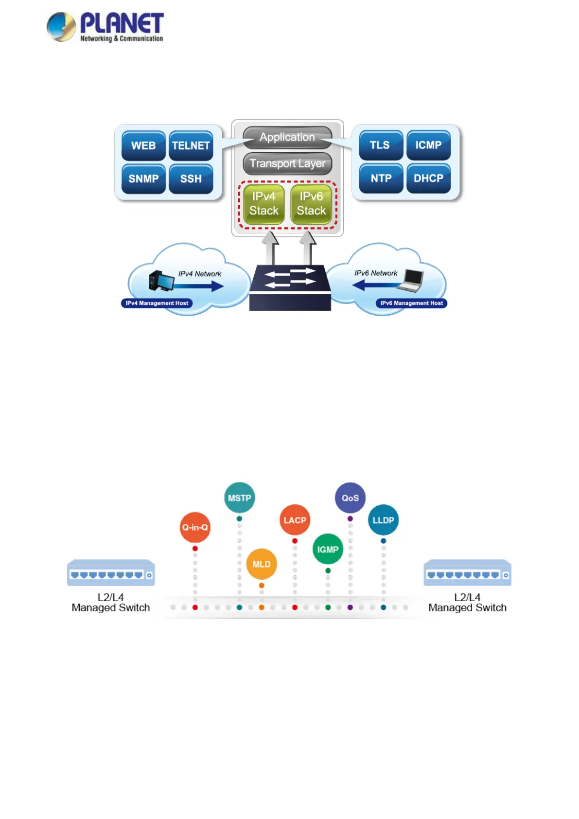 aggregation, 802.1Q VLAN, Q-in-Q VLAN, Multiple Spanning Tree Protocol (MSTP), loop and BPDU guard, IGMP