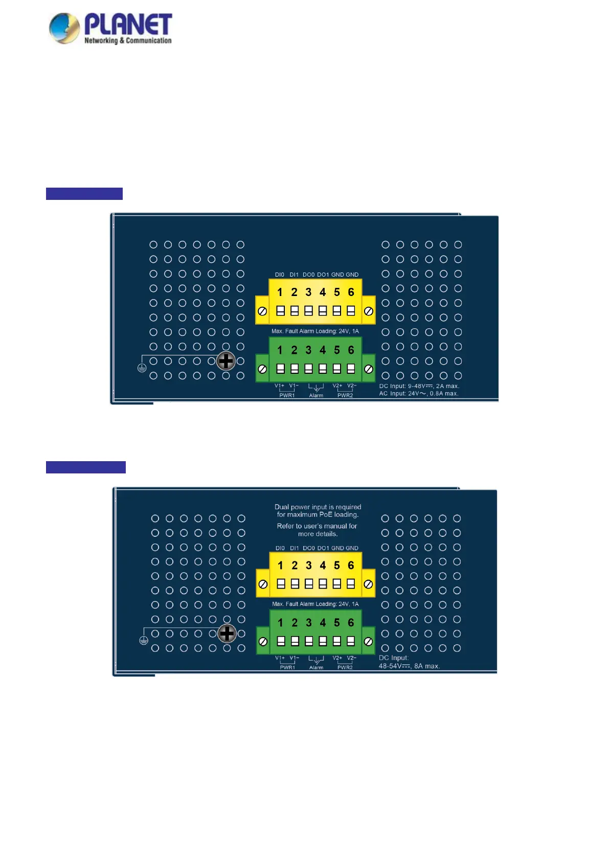 On the industrial managed switch, the upper panel features two terminal block connectors for easy identification and use: the