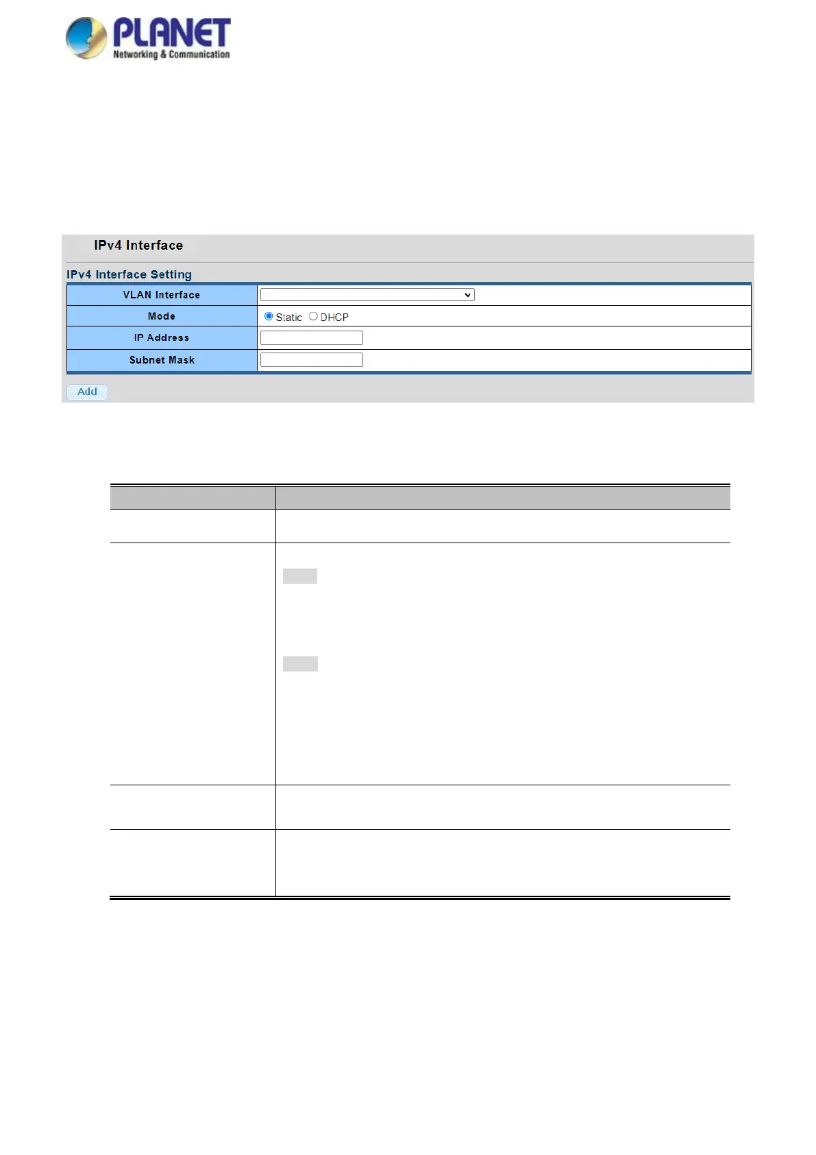 The IPv4 Configuration includes the IPv4 Interface Setting and Vlan interface status. Fill out the IPv4 Address and Subnet Mask