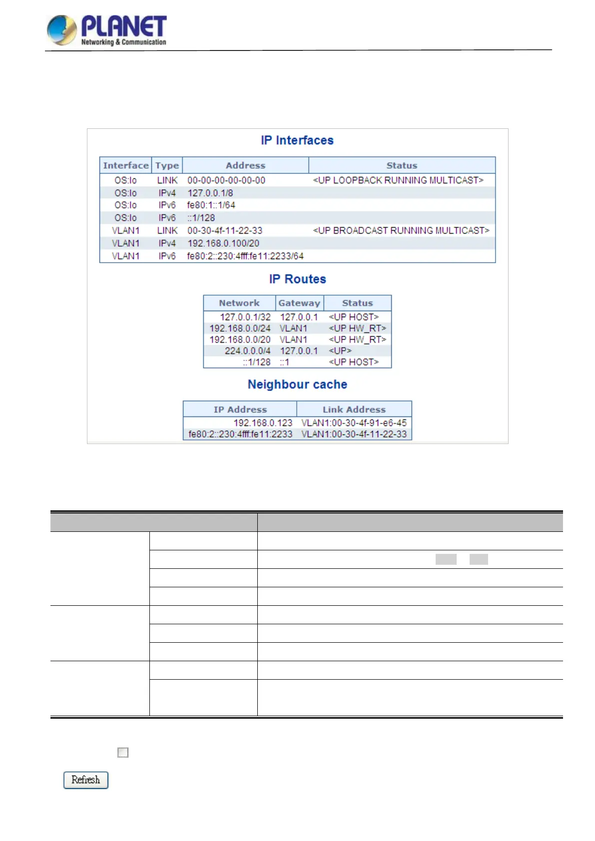 IP Status displays the status of the IP protocol layer. The status is defined by the IP interfaces, the IP routes and the neighbor