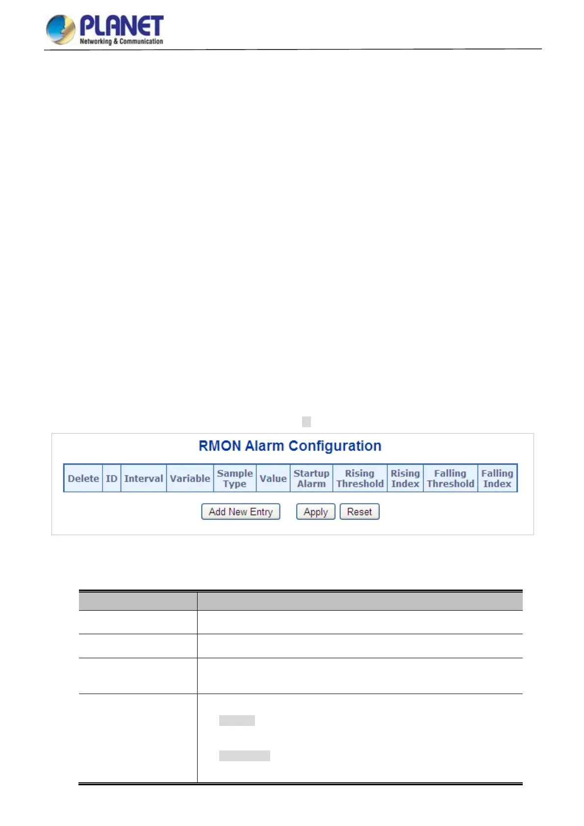 Configure RMON Alarm table on this page. The entry index key is ID.; screen in Figure 4-2-3-1 appears.