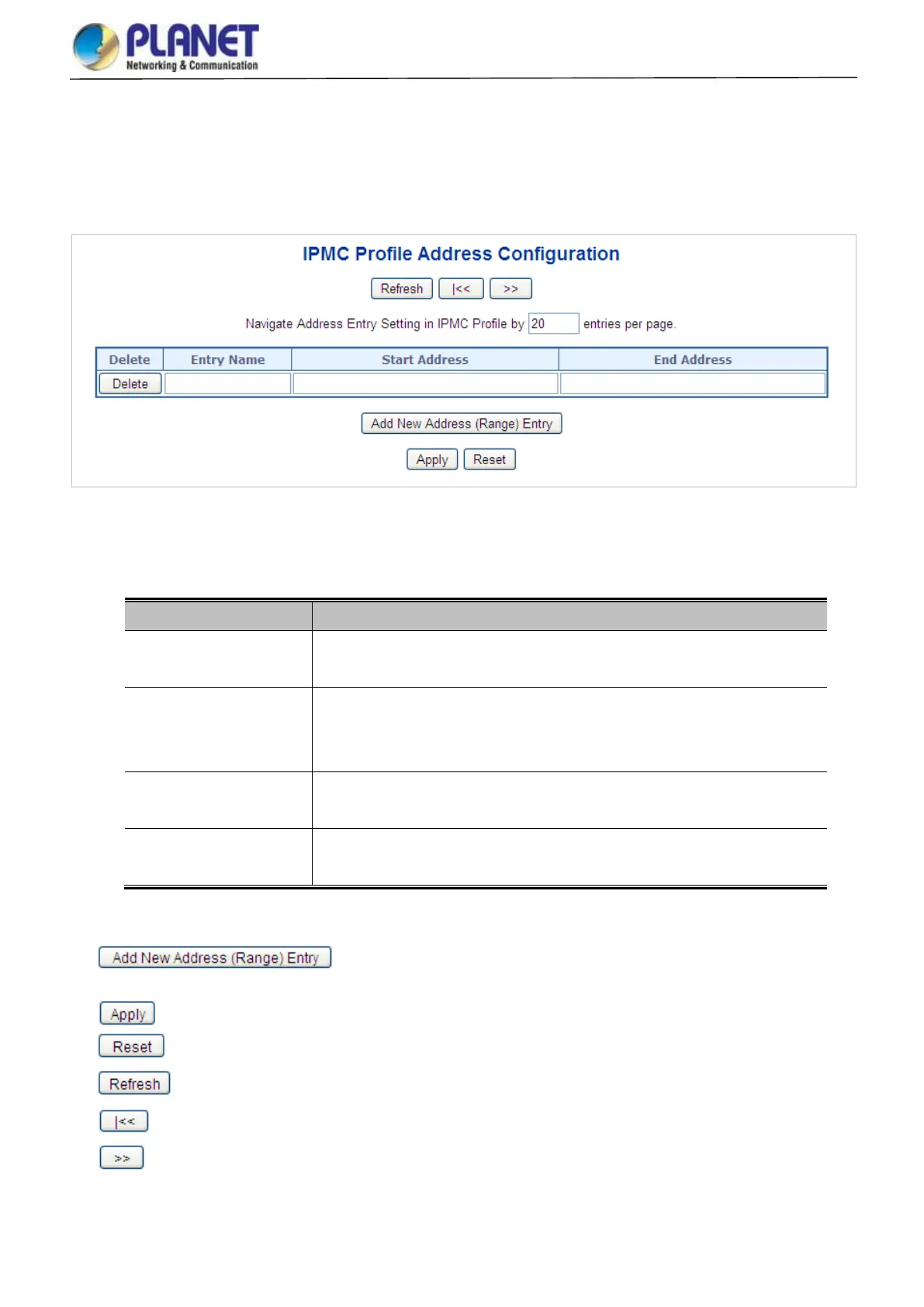 This page provides address range settings used in IPMC profile. The address entry is used to specify the address