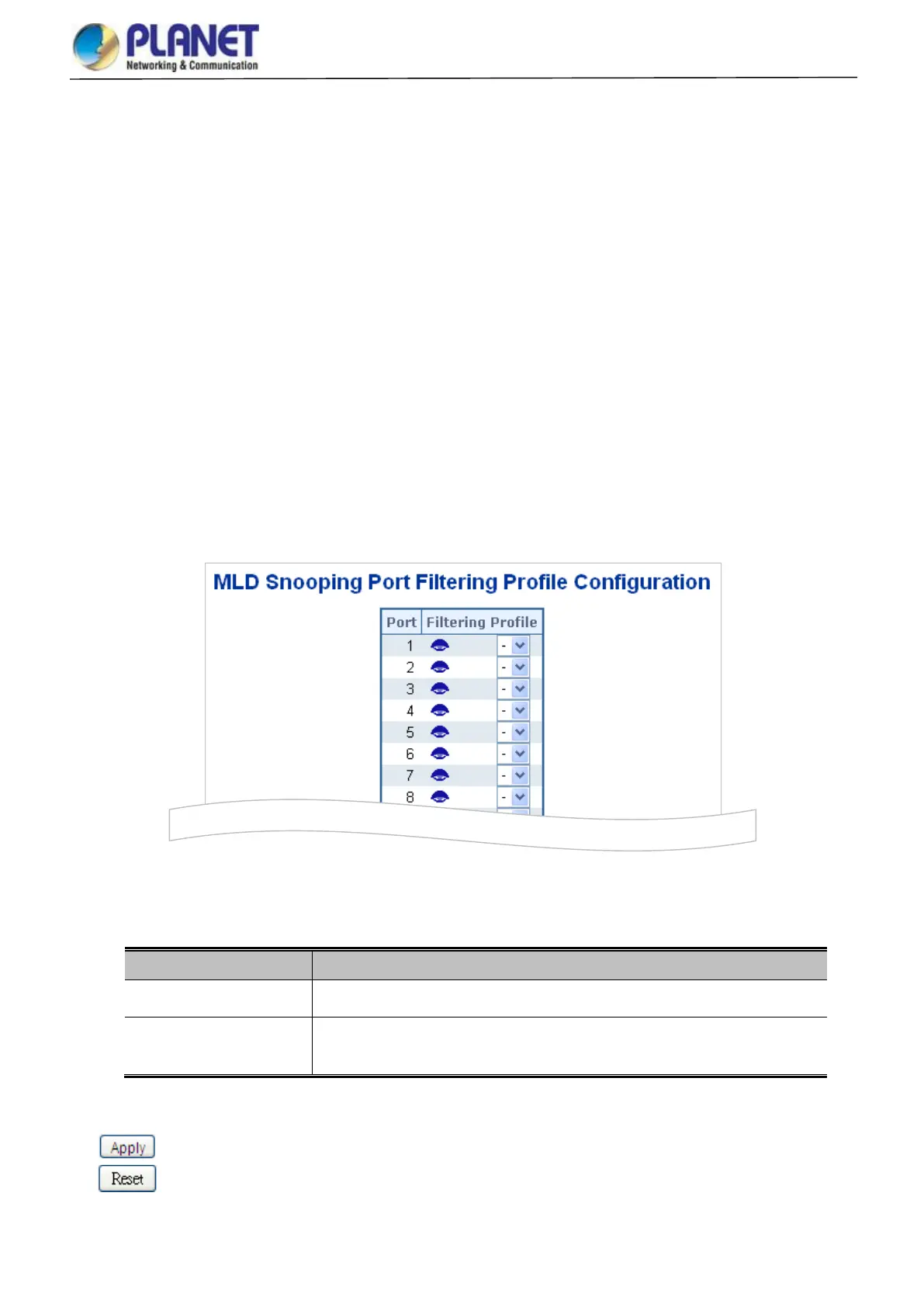 port. When enabled, MLD join reports received on the port are checked against the filter profile. If a requested multicast group