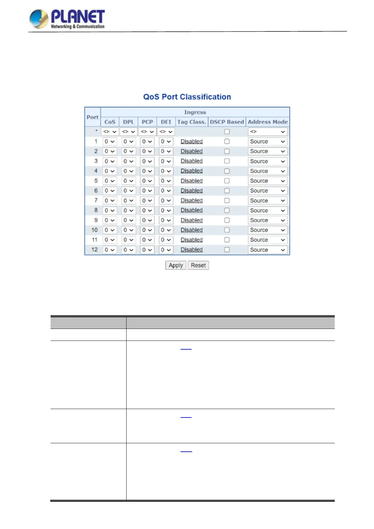This page allows you to configure the basic QoS Classification settings for all switch ports. The Port classification screen in