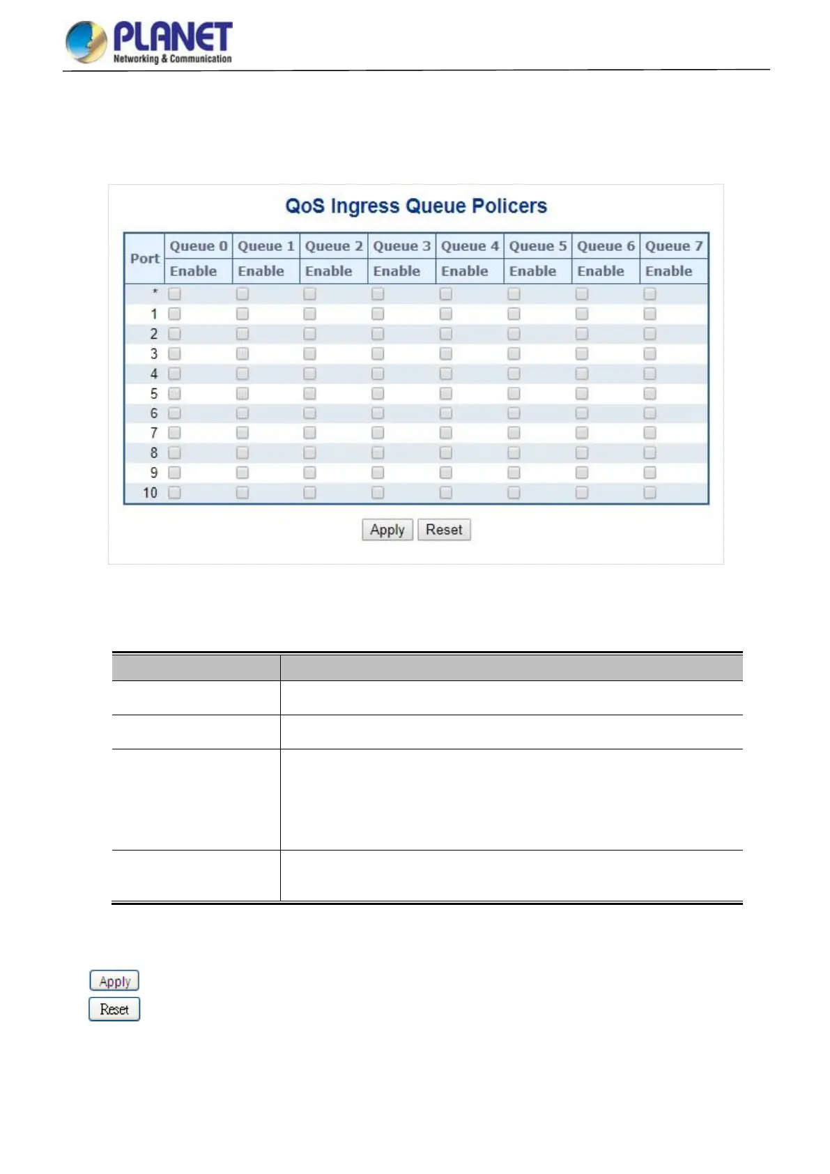 This page allows you to configure the Queue Policer settings for all switch ports.. The Queue Policing screen in Figure 4-4-1-2