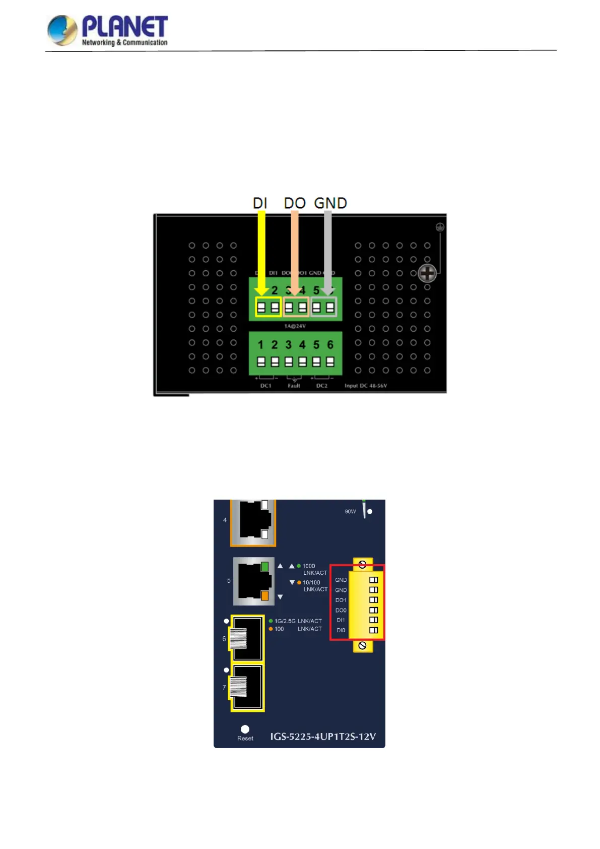 2. The IGS-5225-4UP1T2S-12V offers two DI and DO groups. 1 and 2 are DI groups; 3 and 4 are DO groups; and 5 and 6