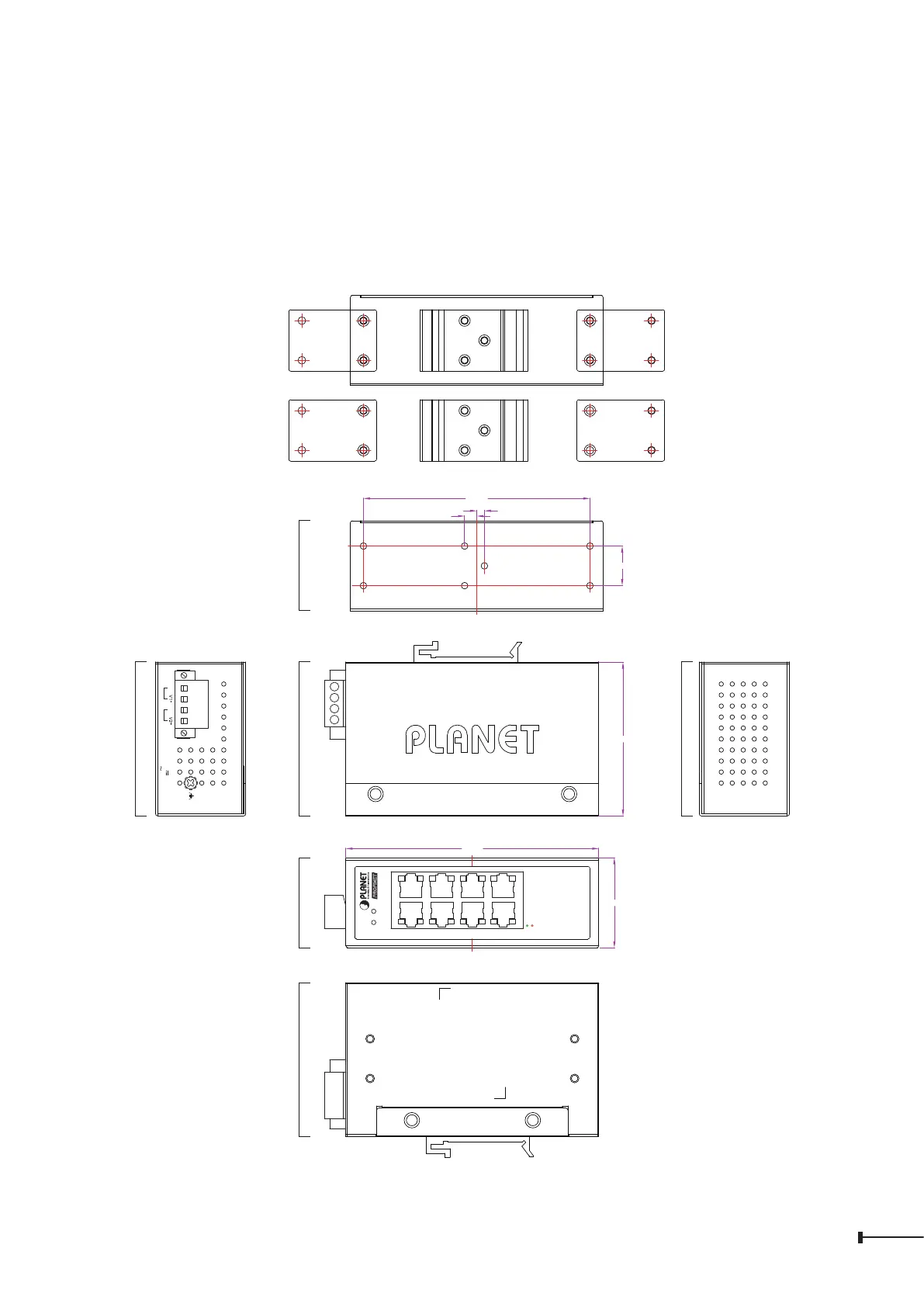 The three-view diagram of the Industrial PROFINET Switch consists of multiple