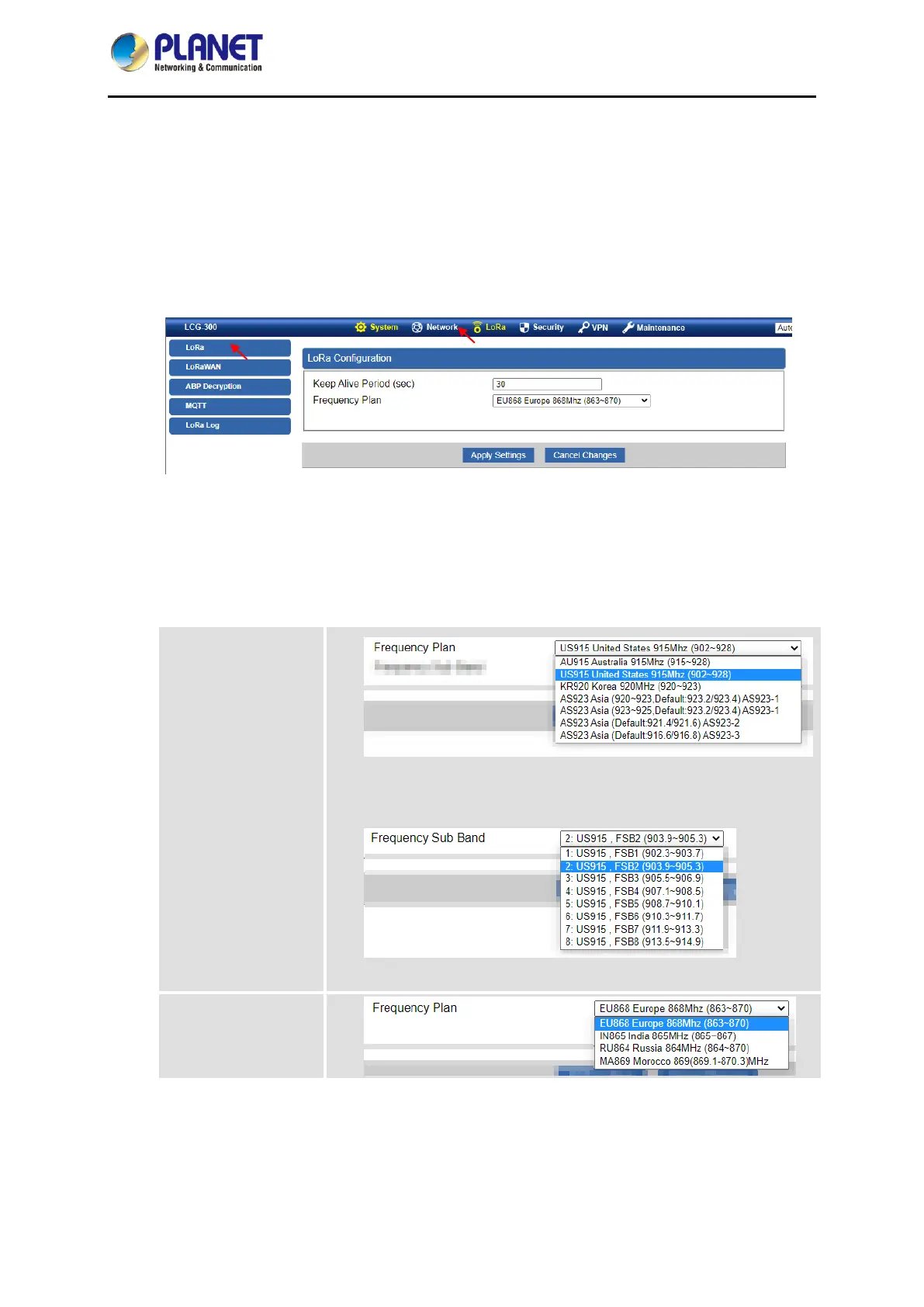 (In this case [LCG-300-US], select “US915” for frequency band and “US915 and FSB2” for