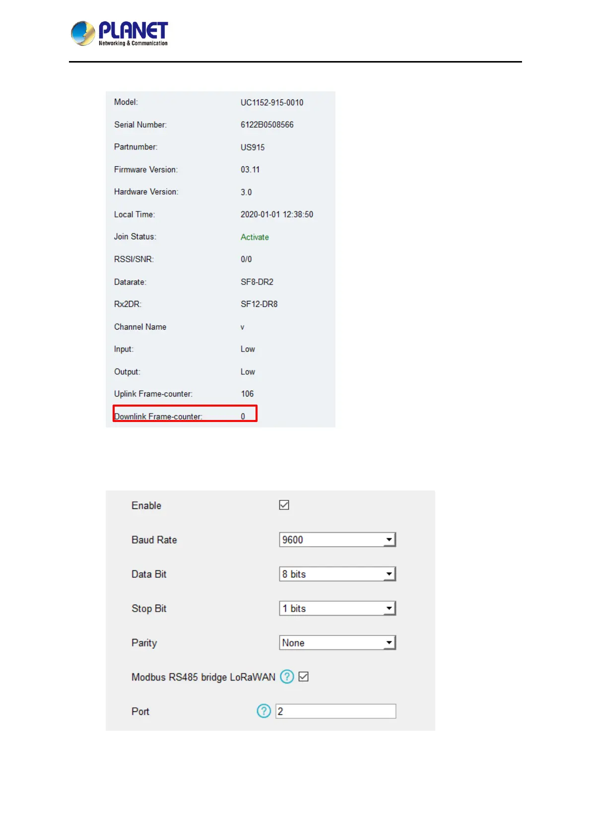 5. Enable the RS-485 setting, check the item of Modbus RS485 bridge LoRaWAN and set Port.