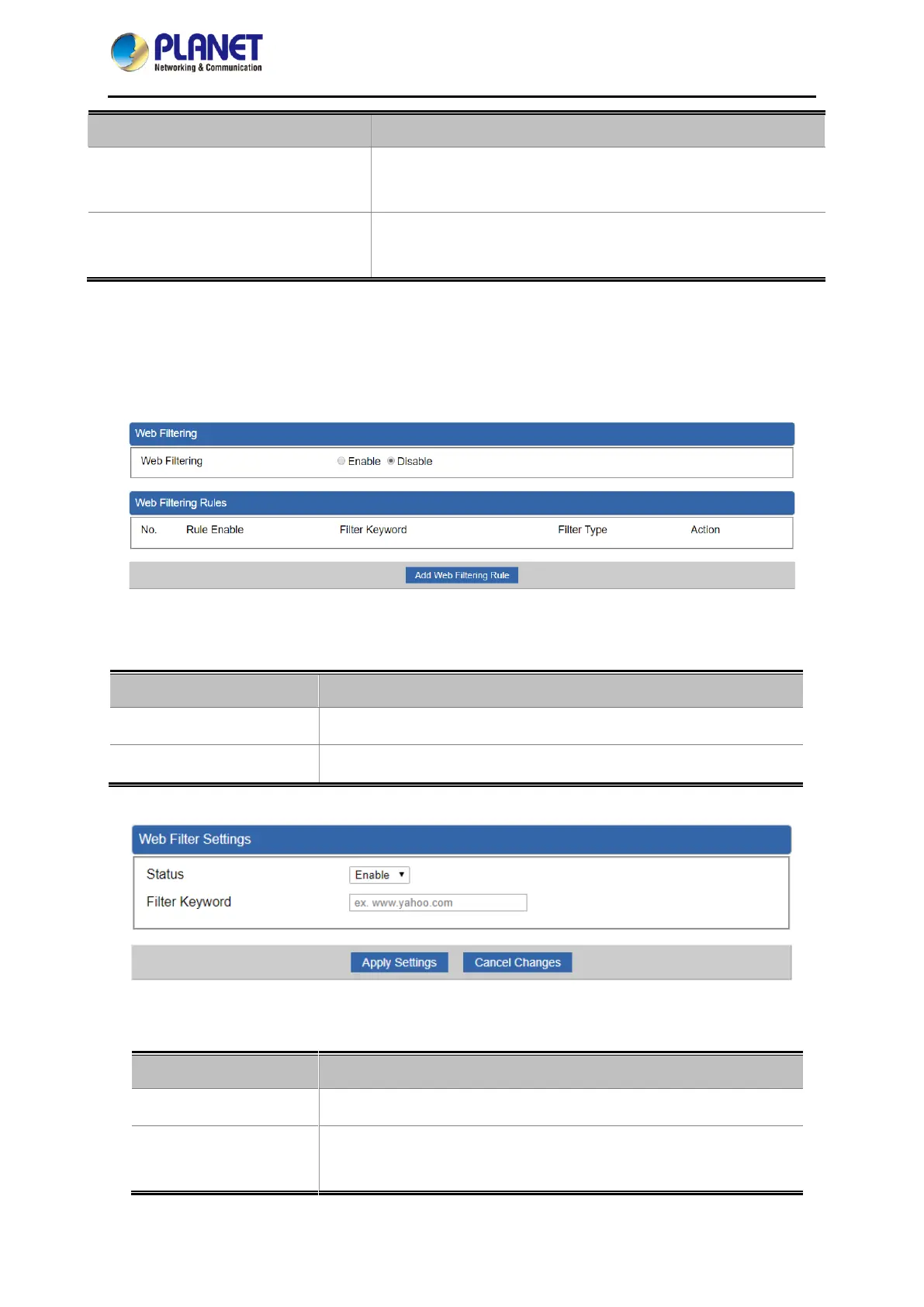 Web filtering is used to deny LAN users from accessing the internet as shown in Figure 4-8-6. Block