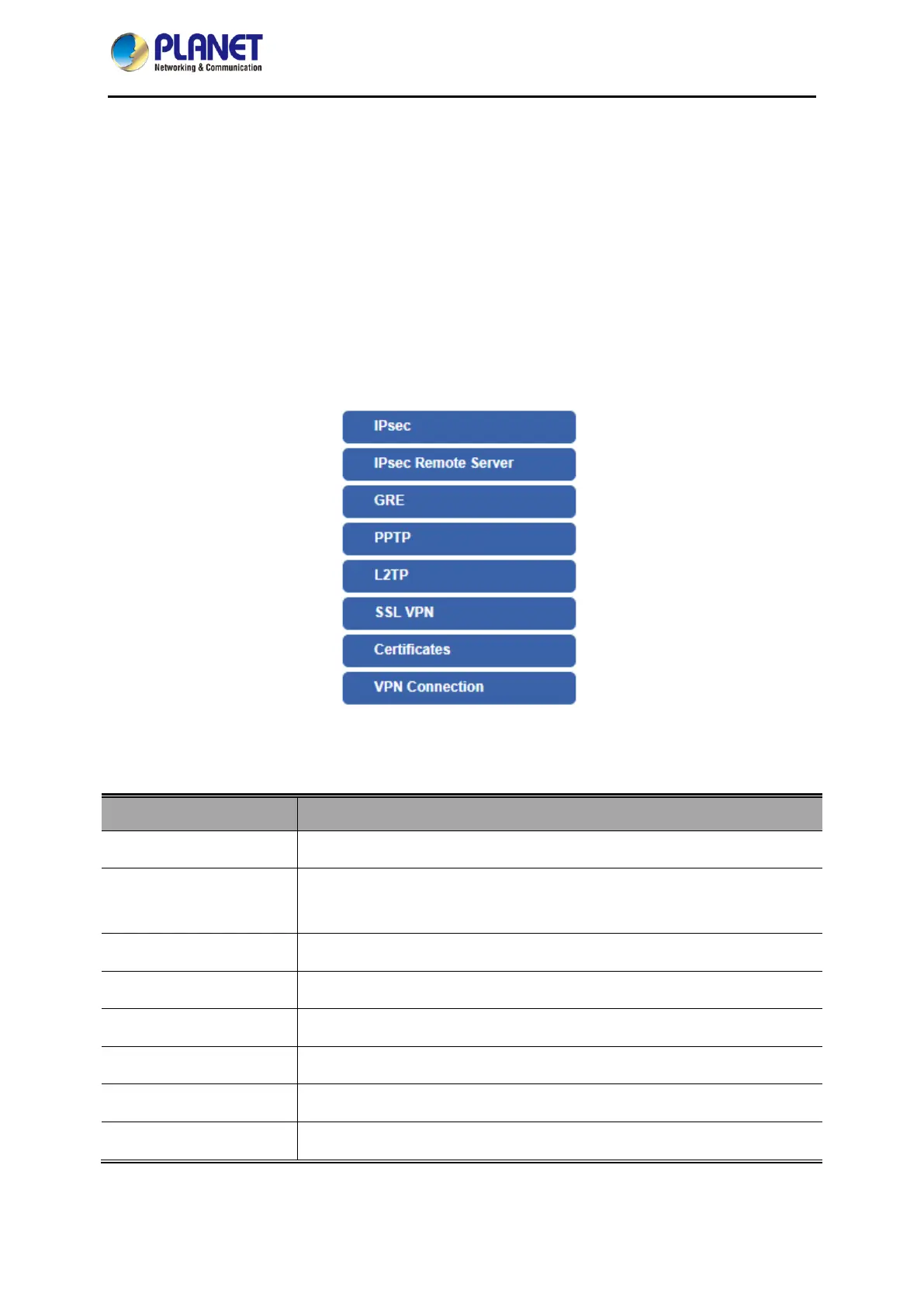 The VPN menu provides the following features as shown in Figure 4-9-1