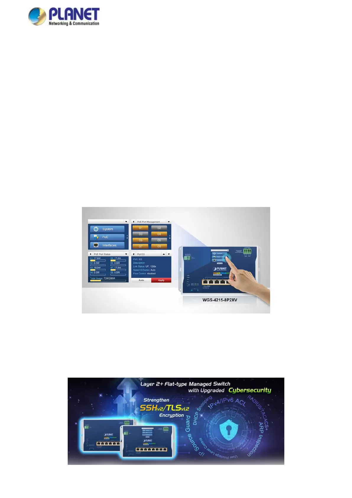 The WGS-4215-8P2XV comes with an intuitive touch panel on its front panel that facilitates the Ethernet PoE PD management