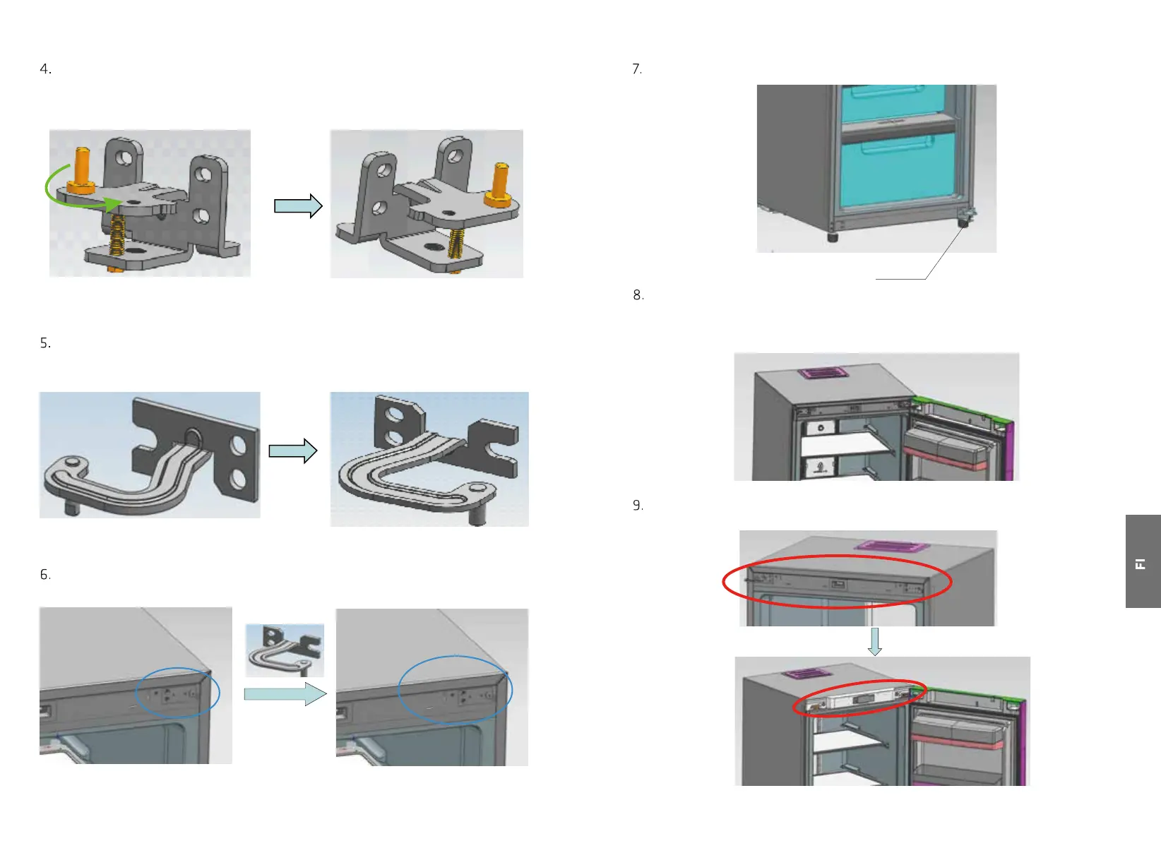 sijoita sitten ovi alasaranoille, paina yläsaranoita saranan kiinnitysjalkoihin