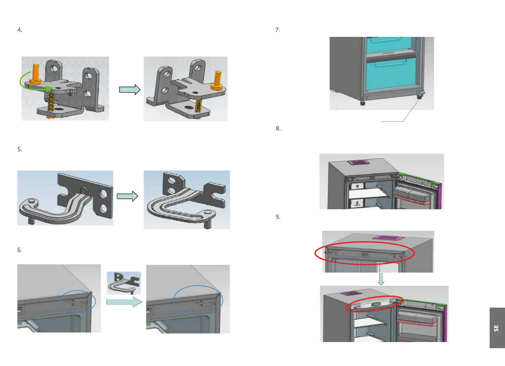 dörren), placera sedan dörren på de nedre gångjärnen, tryck in de övre