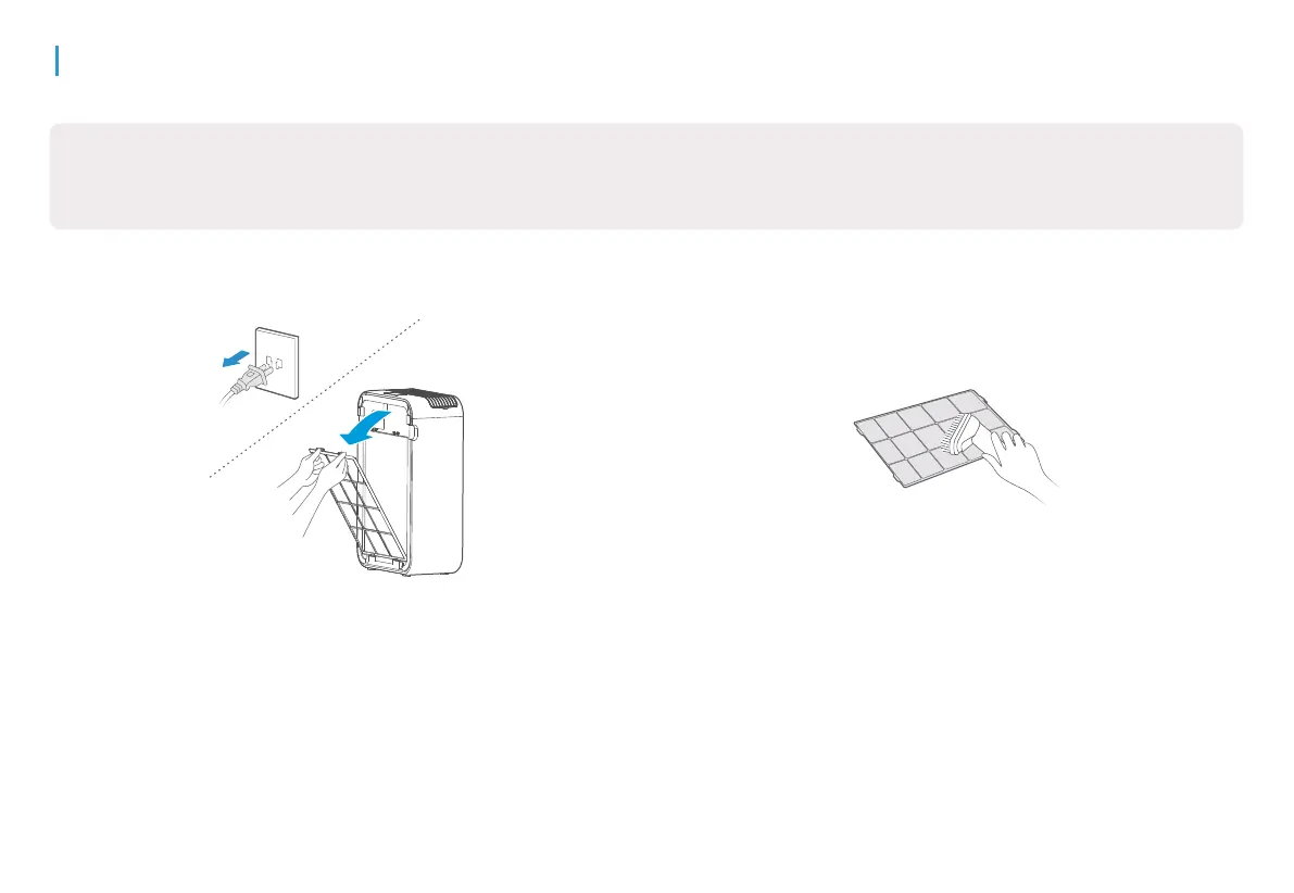 1 Irrota laite pistorasiasta ja irrota esisuodatin. 2 Imuroi pöly tai pyyhi se liinalla.