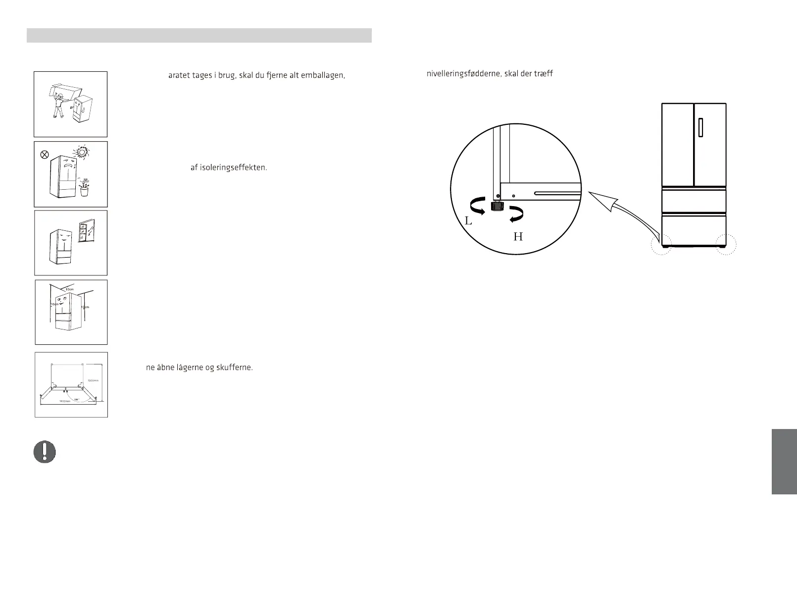 b. Drej fødderne mod uret for at sænke køleskabet;