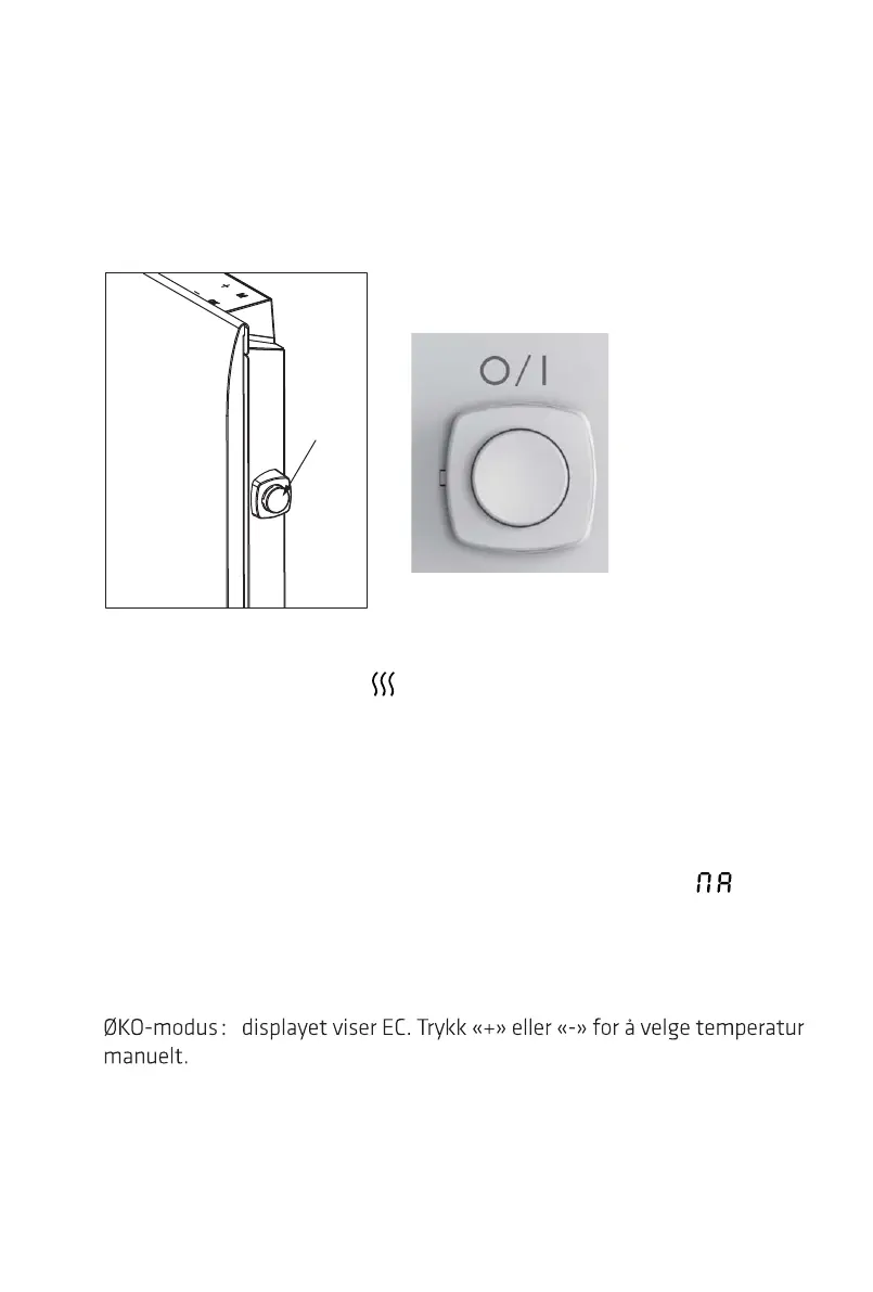 Manuell: displayet viser NA. Trykk «+» eller «-» for å velge temperatur