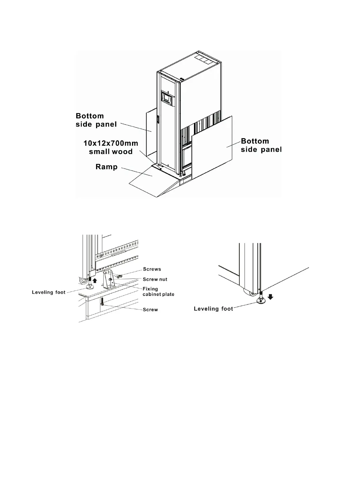 4. Remove 4 fixing cabinet plates and loosen leveling feet by rotating them counterclockwise.