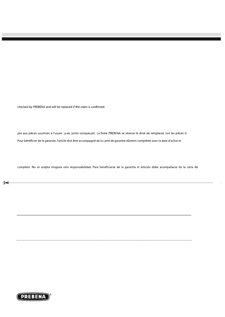 garantía no se extiende a las piezas sometidas a desgaste. PREBENA se reserva el derecho de cambiar bien las piezas defectuosas, bien el artículo