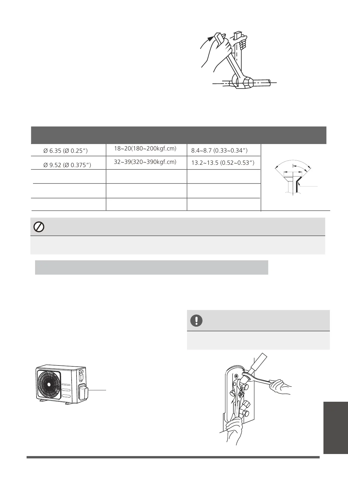 Excessive force can break the nut or damage the refrigerant piping. You must not exceed