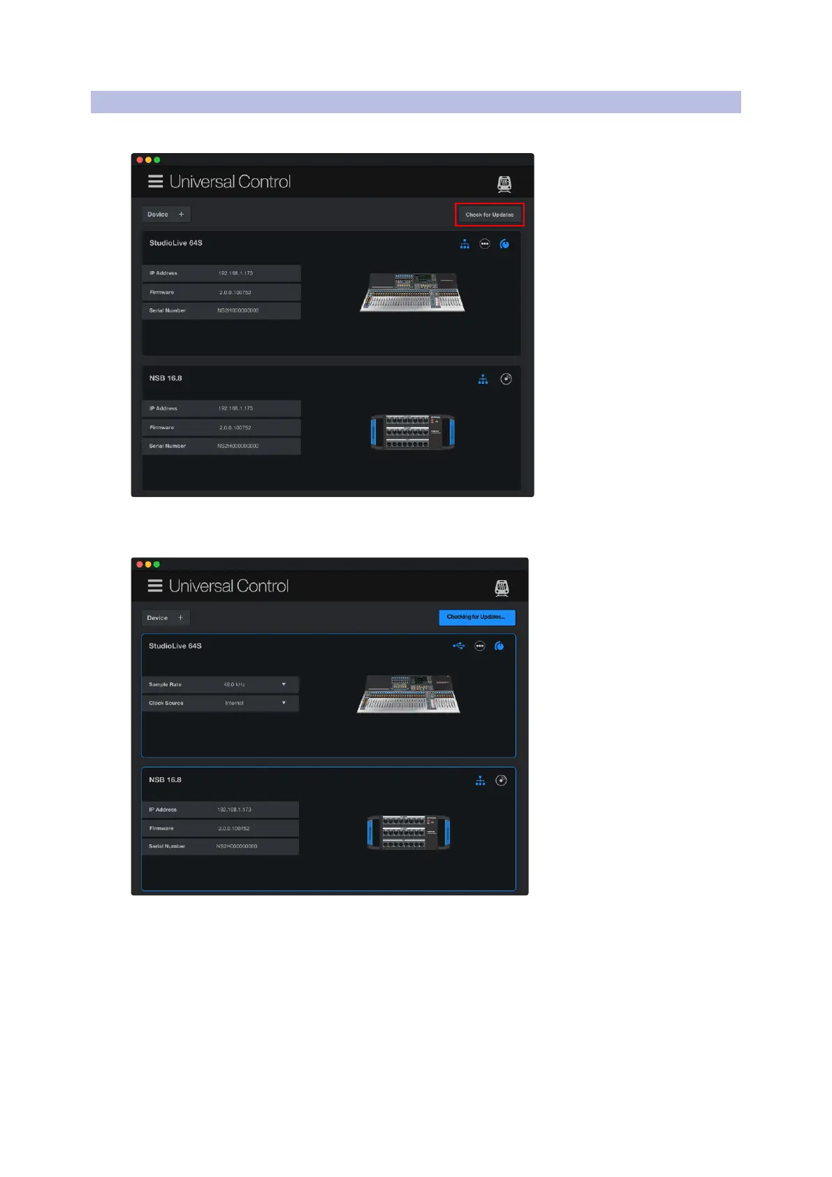 2. Pressing the “Check for Updates” button when Universal Control has access to a valid Internet