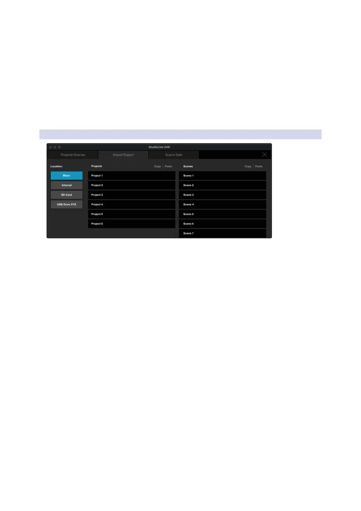 Projects and Scenes can be stored locally on your StudioLive mixer or locally on your computer and copied