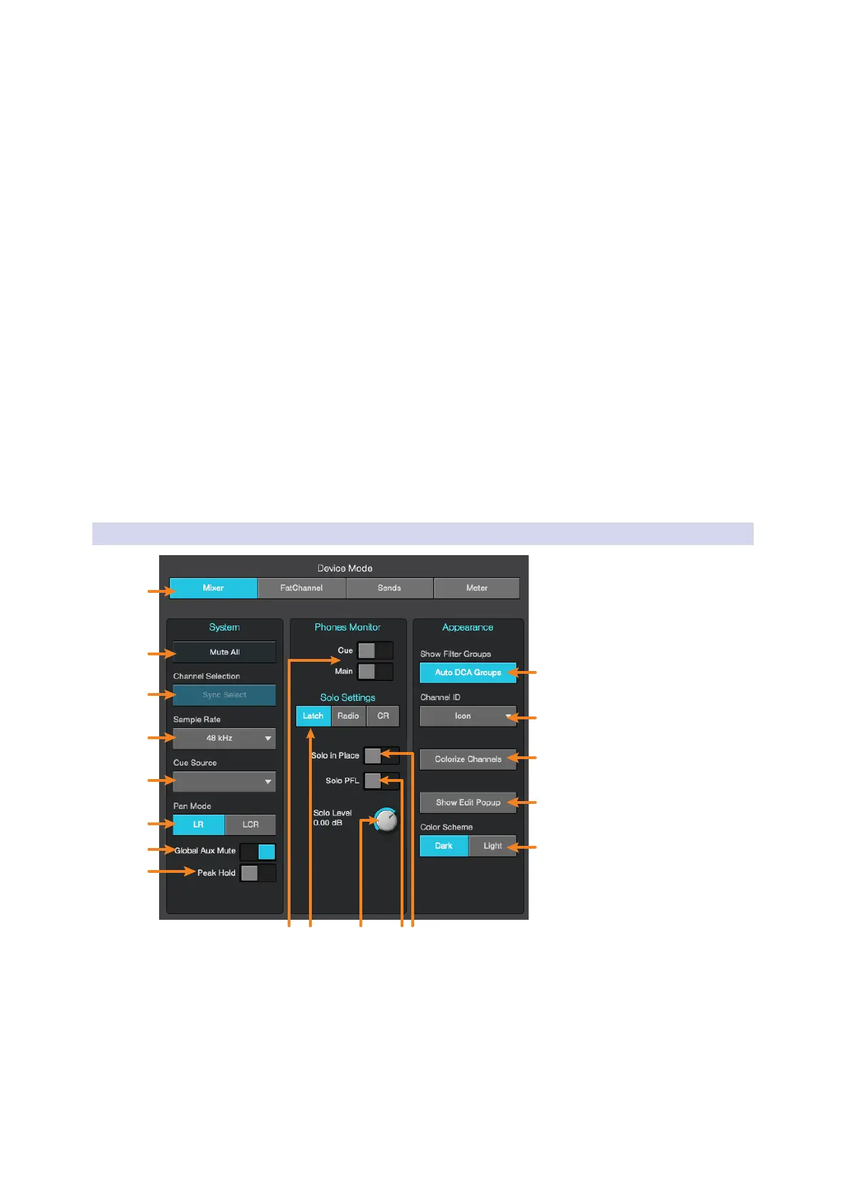 15. Solo PFL On/Off. Enables Pre-Fader Listen (PFL) Soloing. The default setting for the Solo bus is After-