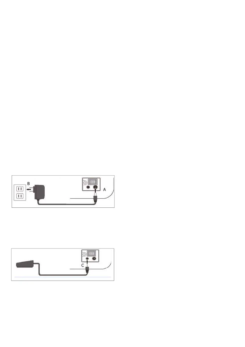 Branchez la fiche de l'adaptateur secteur dans B, comme indiqué dans la figure.