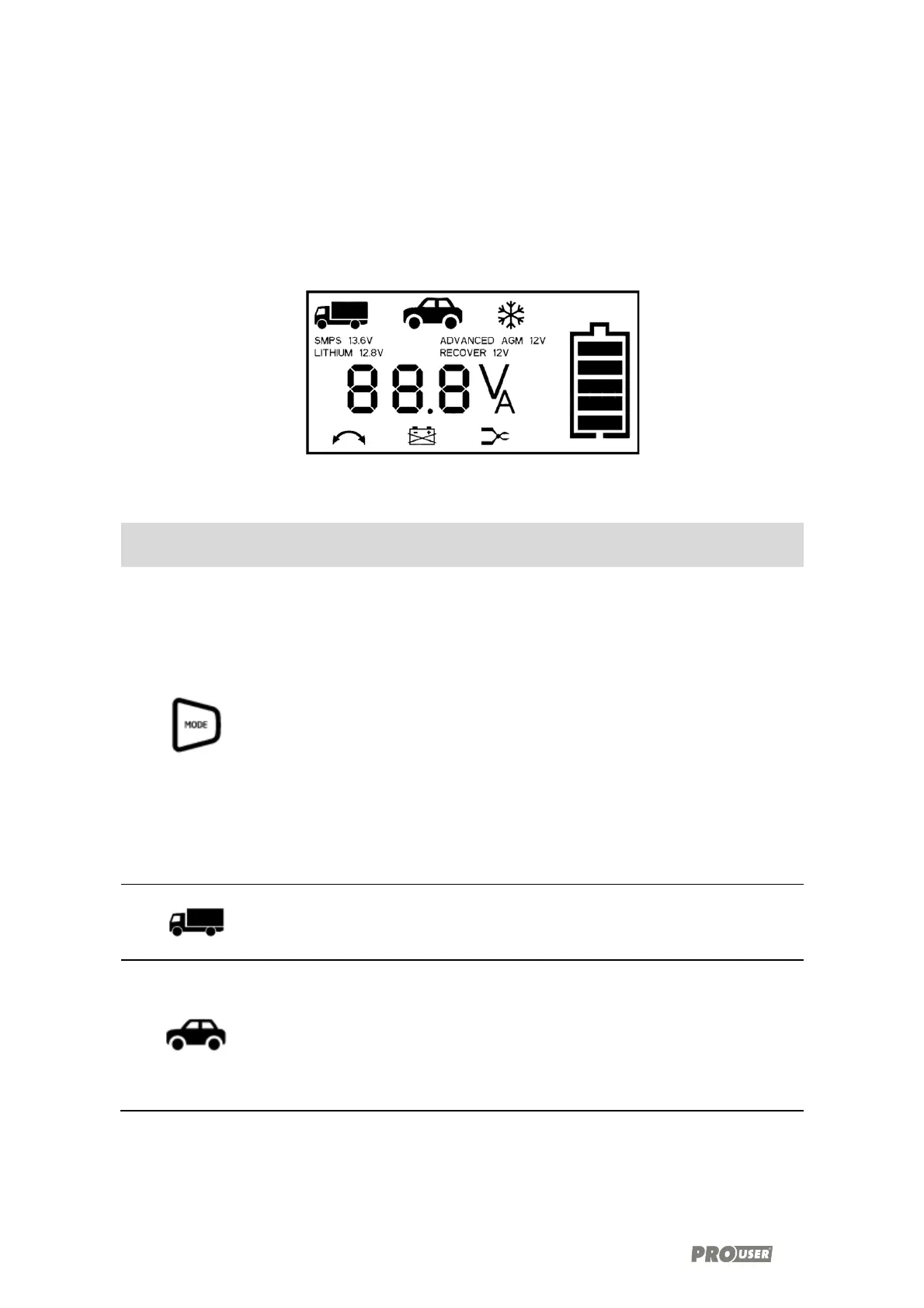 door de lader geselecteerd als een 12V accu. Door op de MODE-knop te