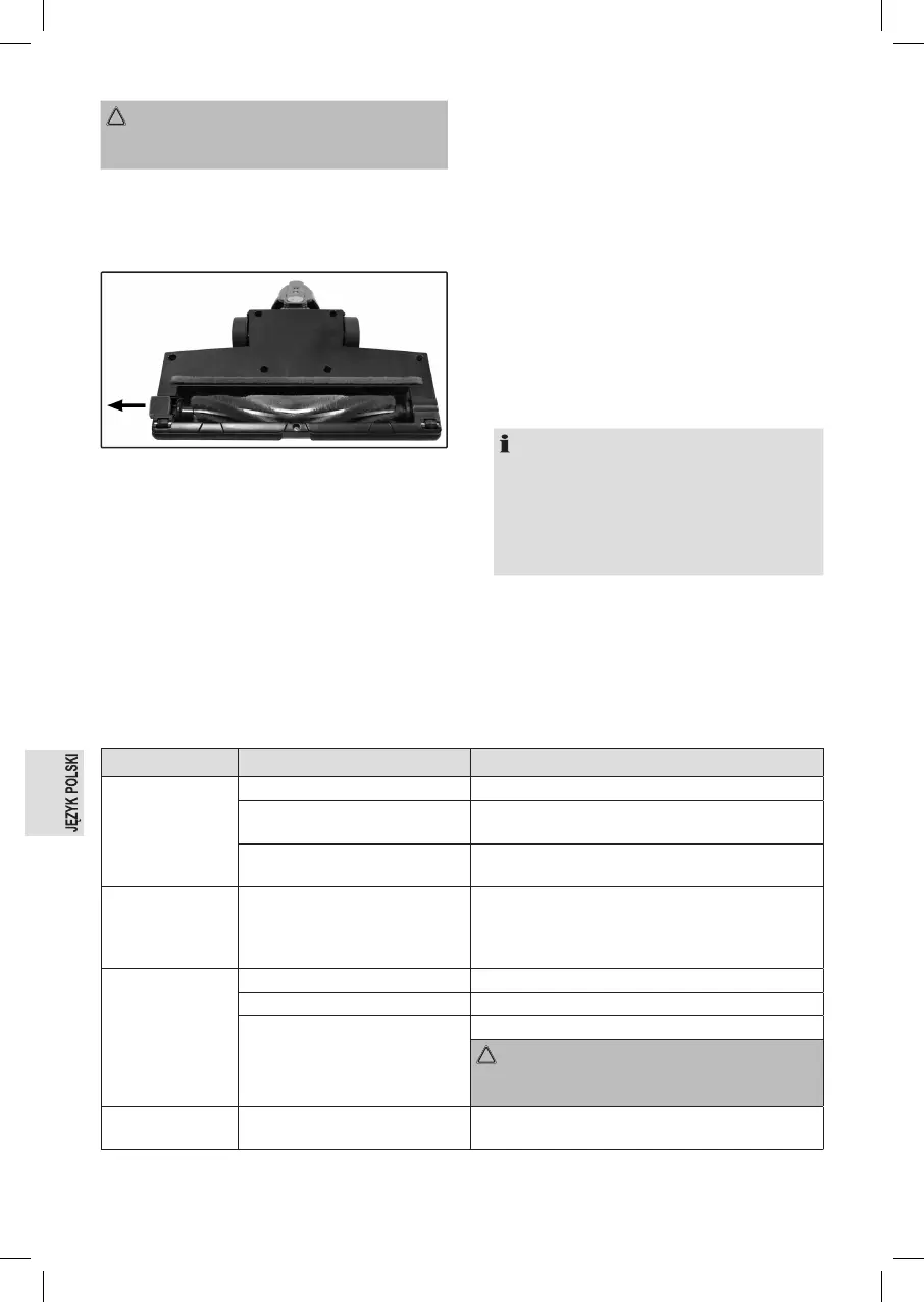 Słaba moc ssania. Akumulator jest niemal rozładowany. Naładuj akumulator.
