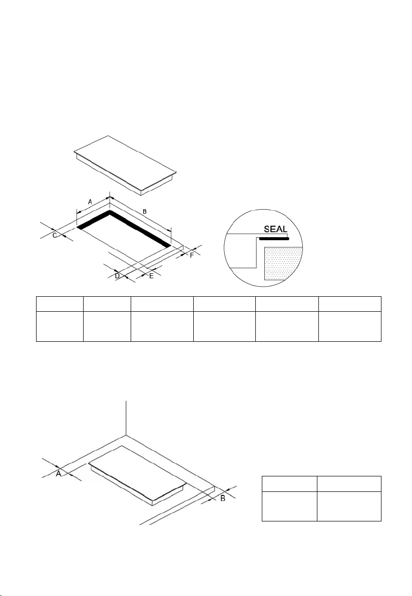 C/D/E/F: minimum distance between the cutout of the hob and the