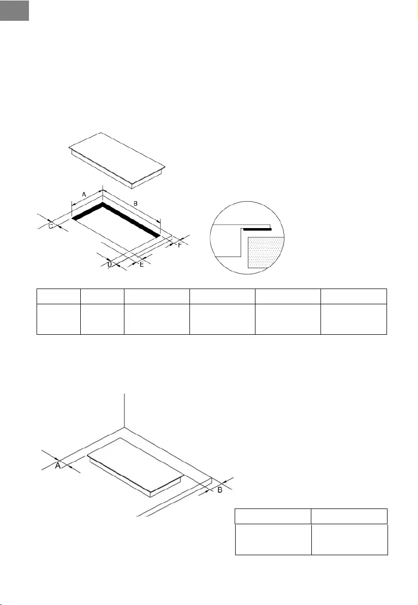 C/D/E/F : distance minimale entre la découpe de la plaque et le mur