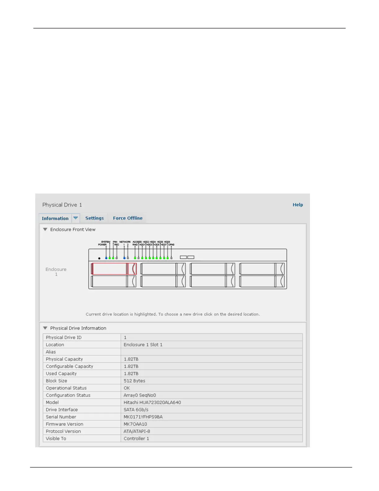 slot in the Physical Drives List, or click on the populated slot in the virtual enclosure displayed in the menu.
