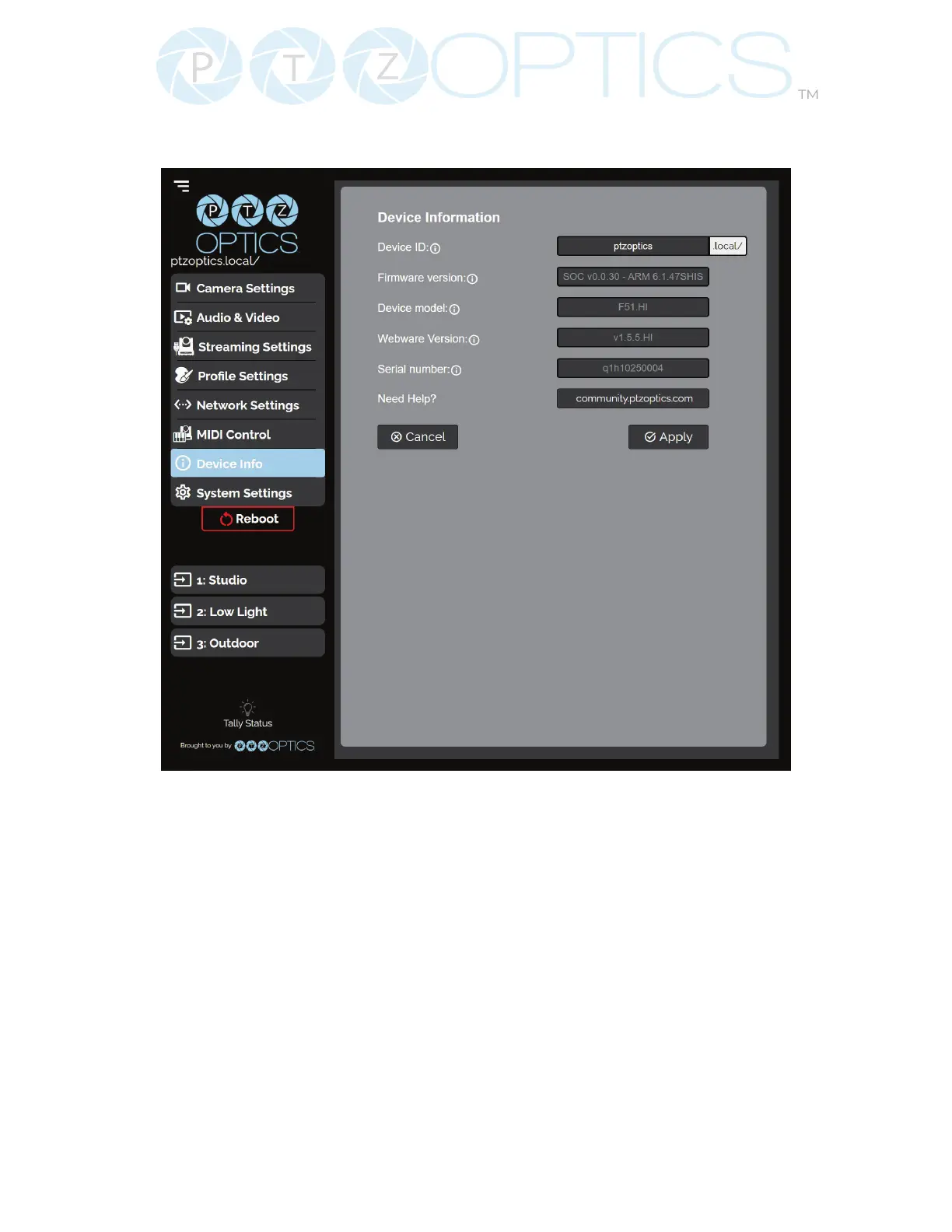 Ŝ Device Model: The Device Model is a eld that PTZOptics uses to designate