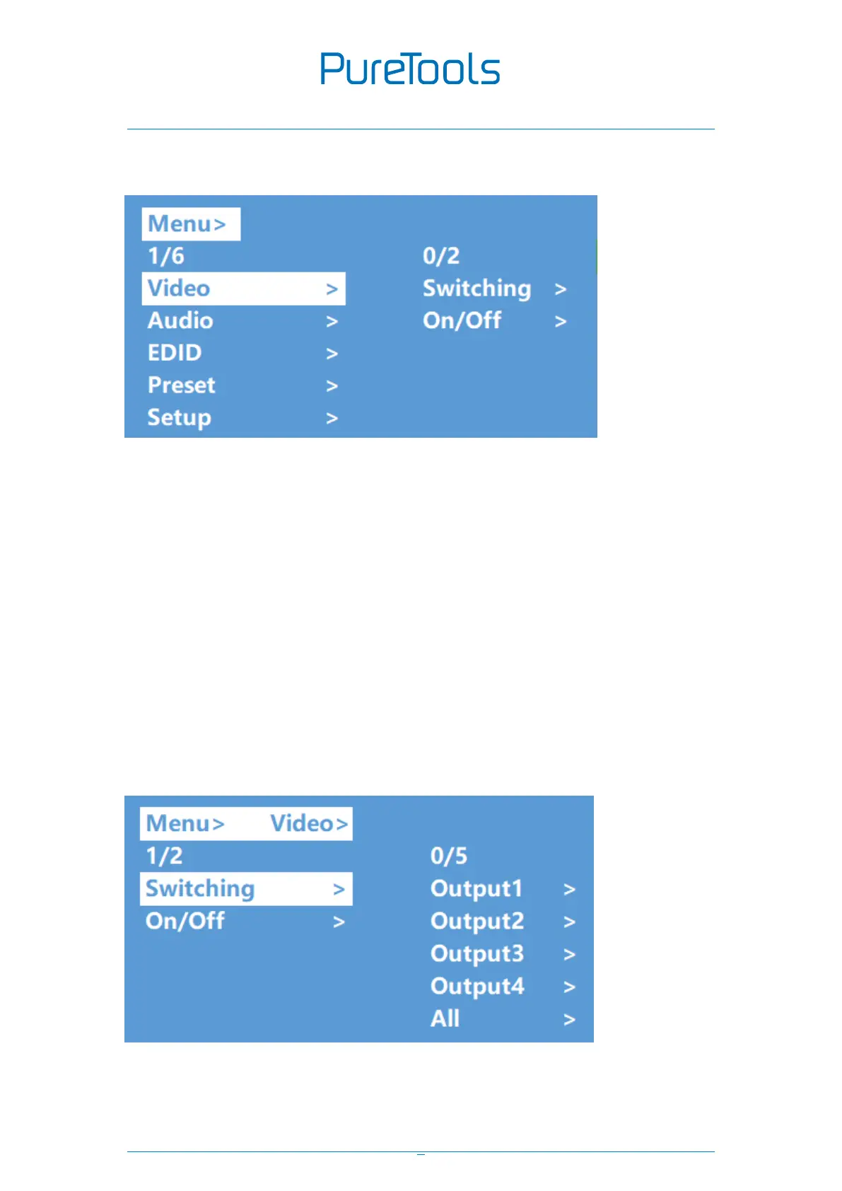 There are 2 sub-menus in video interface:1. switching 2. On/Off