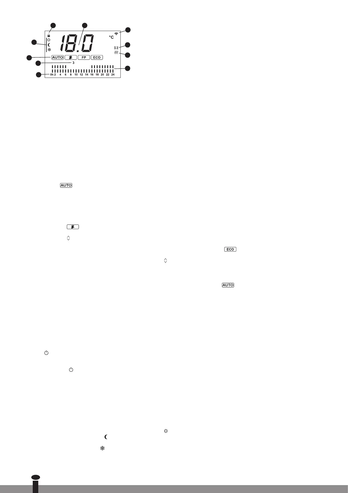 teella (comfort, eco tai pakkassuojaus). Näytössä olevat palkit ilmaisevat tunti- ja vuorokausilämpötilan ohjelmoinnin.